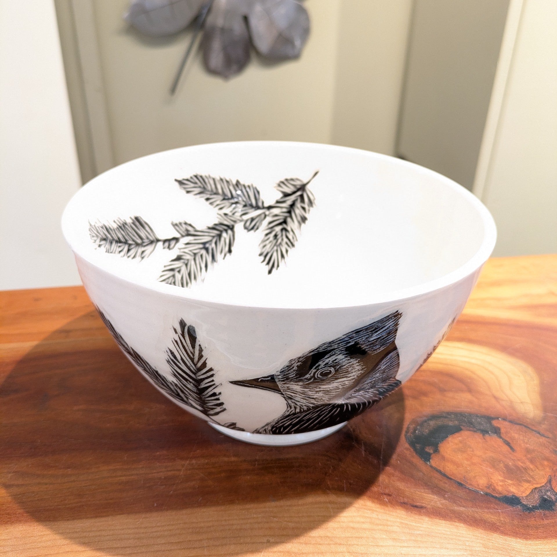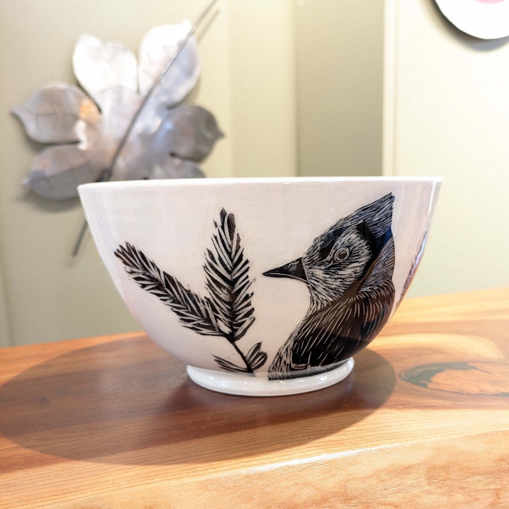 This serving bowl is perfectly functional, but it is so much more than that. Amanda Kerr's exceptional attention to detail shines in this bowl. She makes this perfectly formed bowl with a silky smooth glaze as the simple backdrop for her stunning black and white artwork. Part of the design has a carved outline so you can feel the design as well as see it. The bonus? The design is carried through the inside, outside, even bottom of the bowl. This piece would be a stunner sitting on your dining or coffee table.