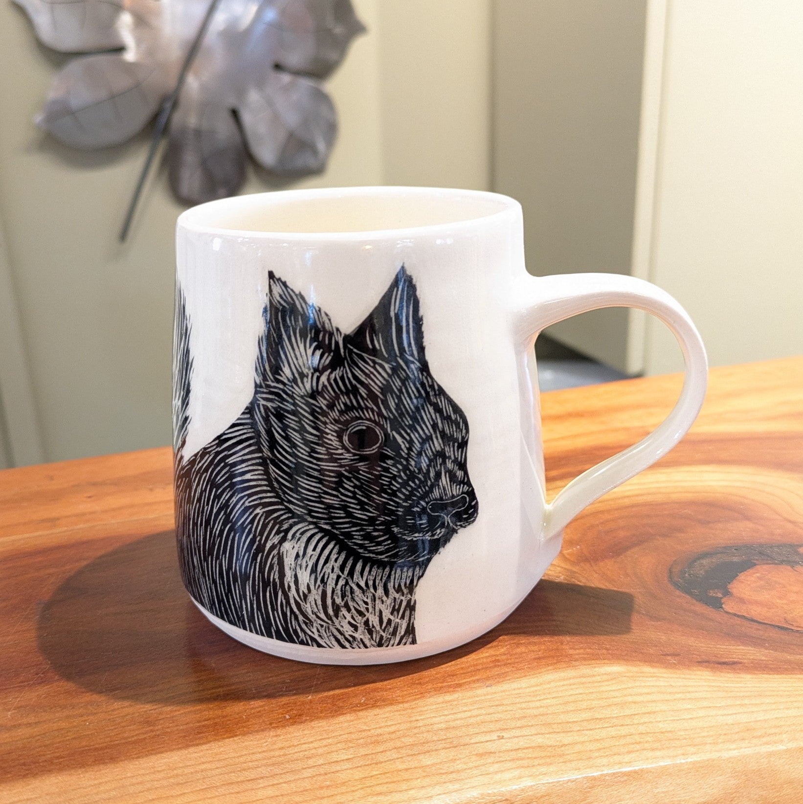 This white clay mug fulfills the design desires of many of our clients. A stunning pattern of course, but also a generous size, tapered form (to keep the heat in) and a finer edge, not too chunky. Amanda puts so much love into each of these, not only in creating the form, but adding her intricately carved squirrel and branch designs.