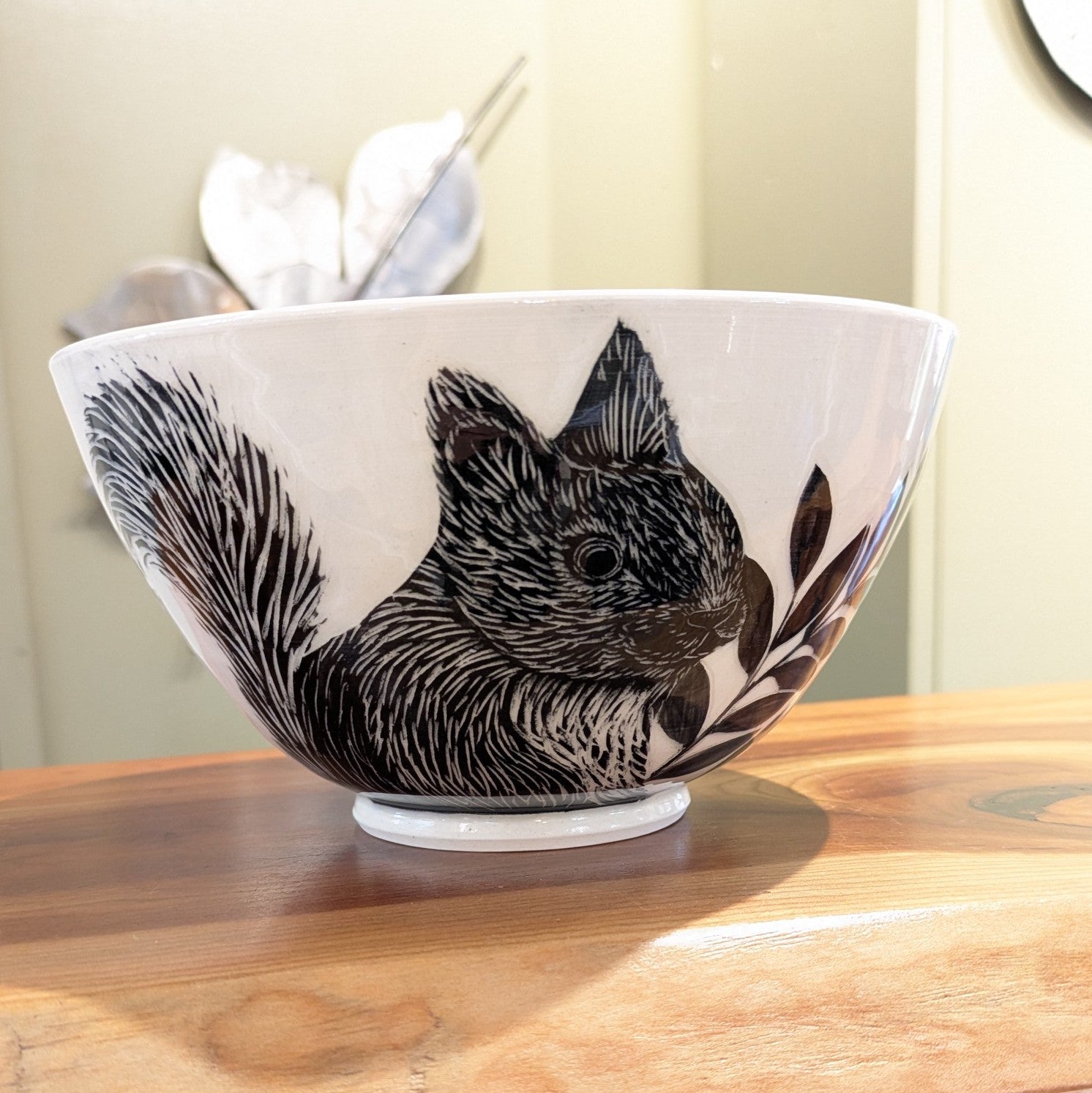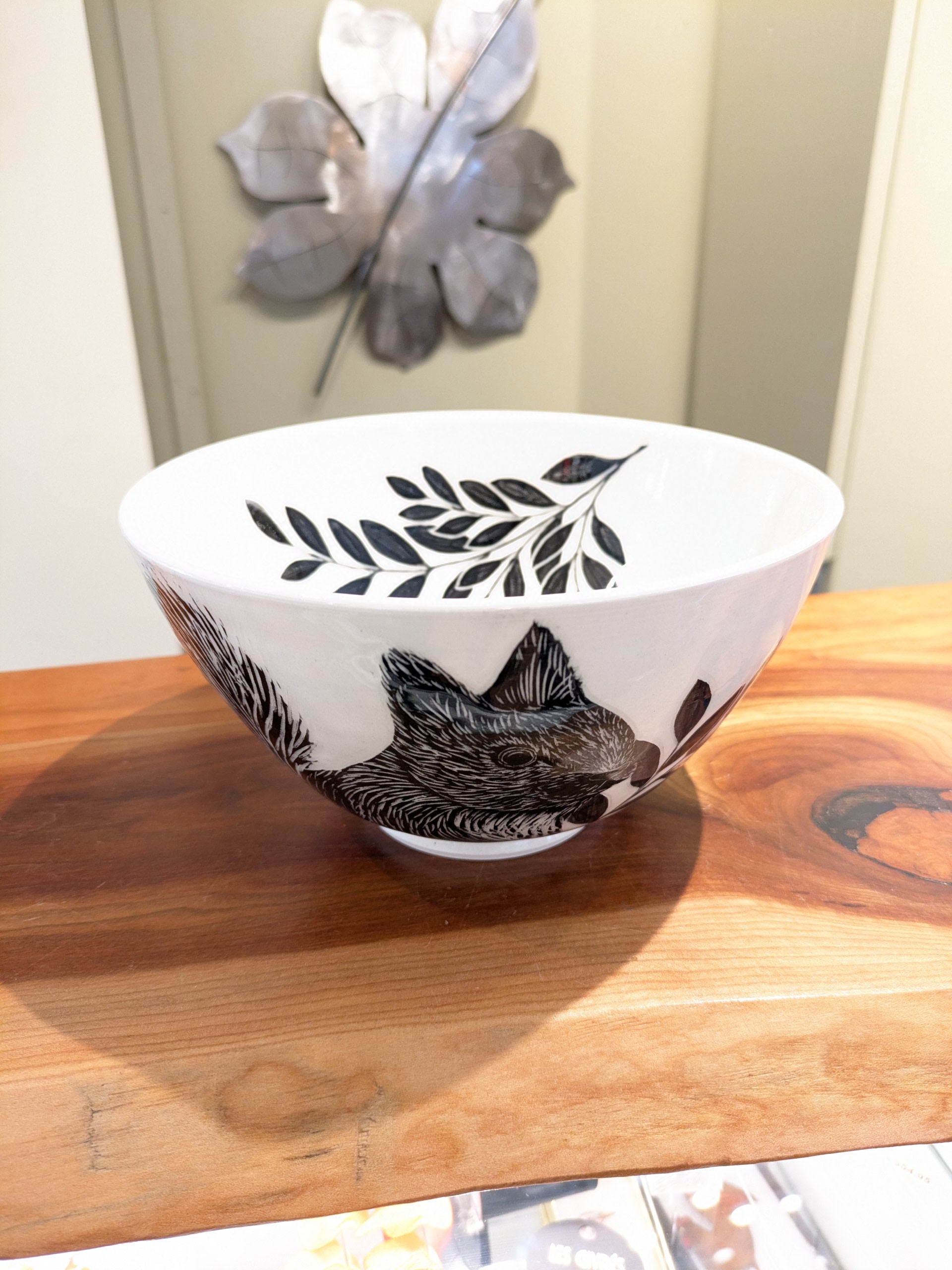 This serving bowl is perfectly functional, but it is so much more than that. Amanda Kerr's exceptional attention to detail shines in this bowl. She makes this perfectly formed bowl with a silky smooth glaze as the simple backdrop for her stunning black and white artwork. Part of the design has a carved outline so you can feel the design as well as see it. The bonus? The design is carried through the inside, outside, even bottom of the bowl. This piece would be a stunner sitting on your dining or coffee table.
