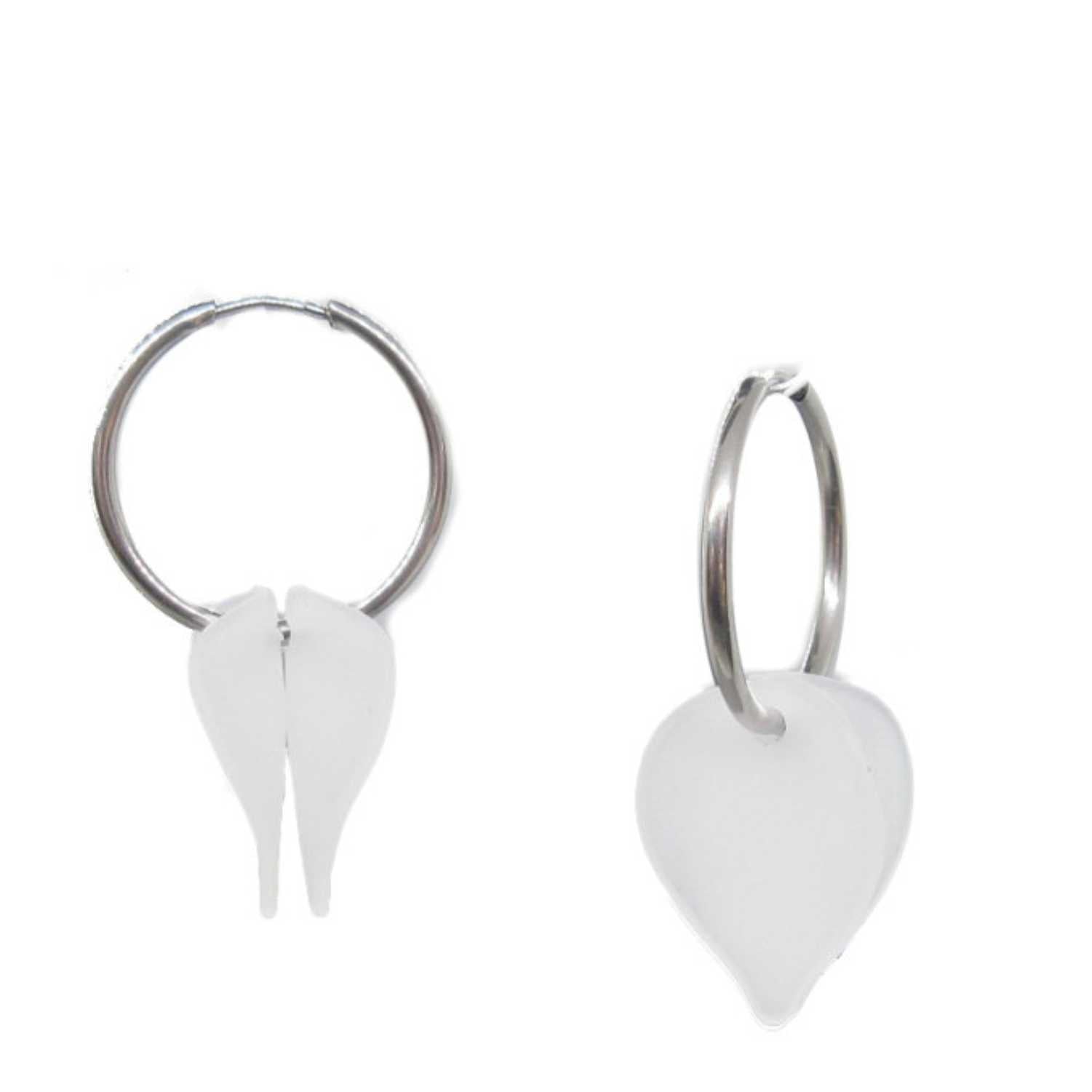 These small white petals are light as air and softly frosted, like the name "Les Givres". Sonia's earring design is made from recycled plastic forms. She adds a subtle curve and a matte finish to the pieces to complete this effortless design. These little resin petals swing easily from sterling silver ear hoops.