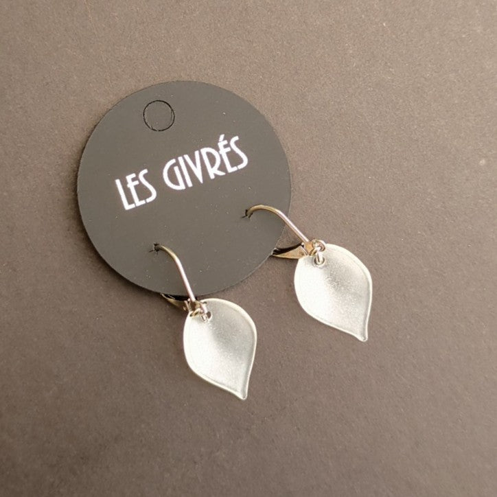 These small white petals are light as air and softly frosted, like the name "Les Givres".  Sonia's earring design is made from recycled plastic forms.  She adds a subtle curve to the piece and a matte finish, to complete this effortless design.  These pieces swing easily from stainless steel lever back ear wires.