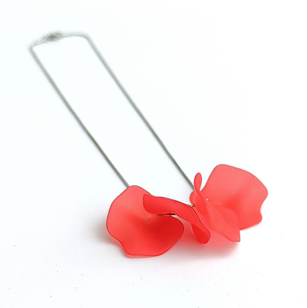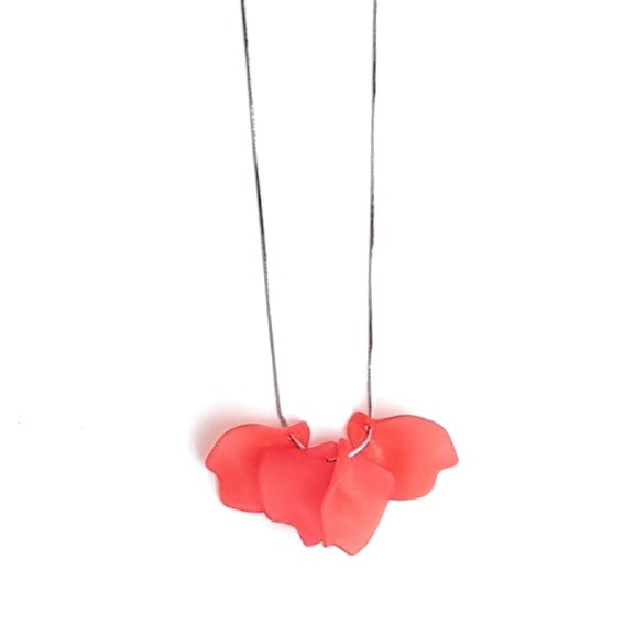 Light as air and ever changing. Sonia transforms simple recycled plastic forms into this unusual and delicate necklace.  Each element has a fluted curved shape and matte finish. Clustered onto a stainless steel chain with lobster clasp, the elements move with you, always changing their arrangement.