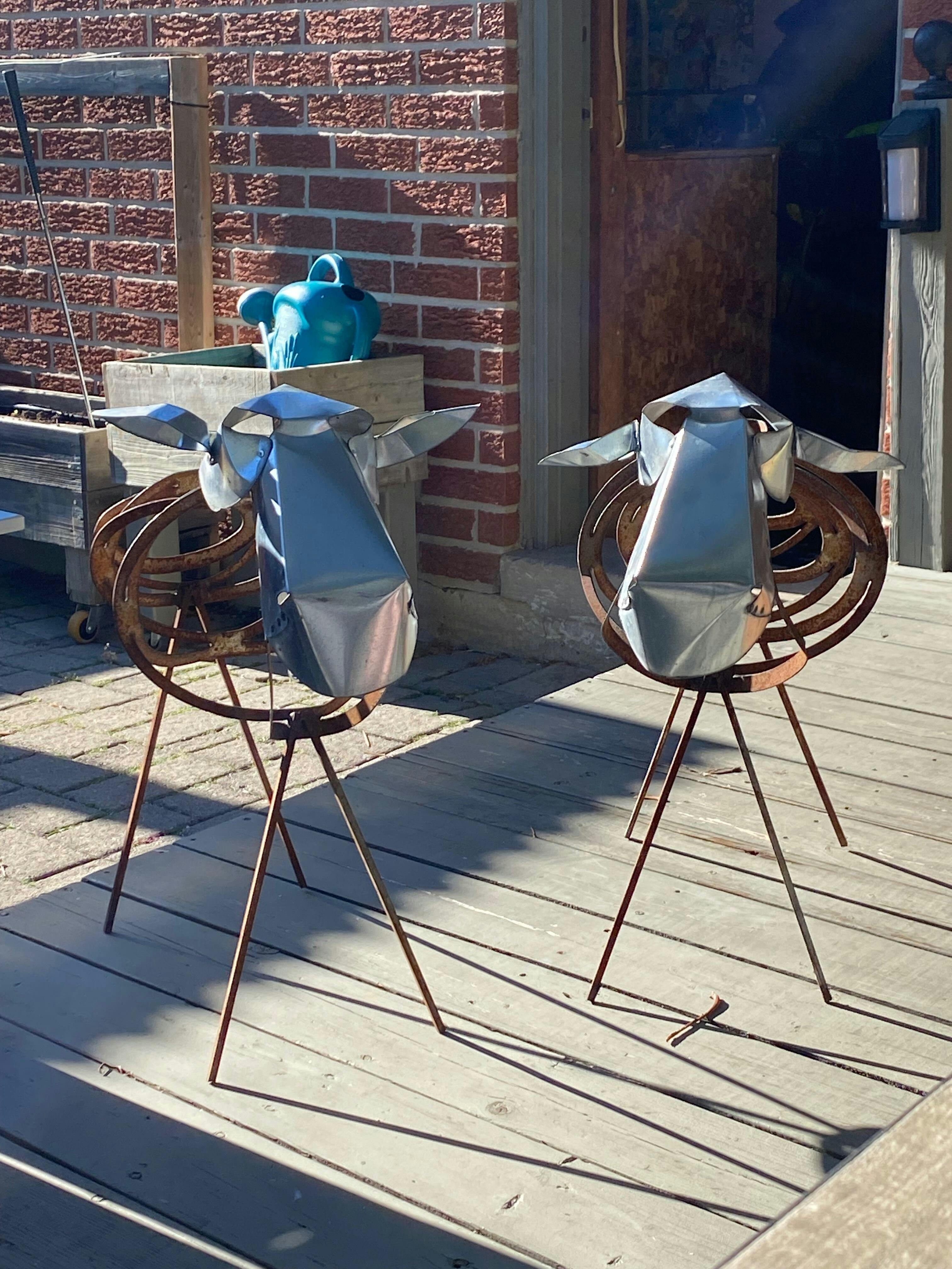 We make the planter out of two types of steel. The head is galvanized which can vary from a mottled bright silver to dull silver over time. The body will develop a rust finish which requires no maintenance. The ears are rivetted onto the head and are meant to be a bit floppy so you can rotate them to suit.