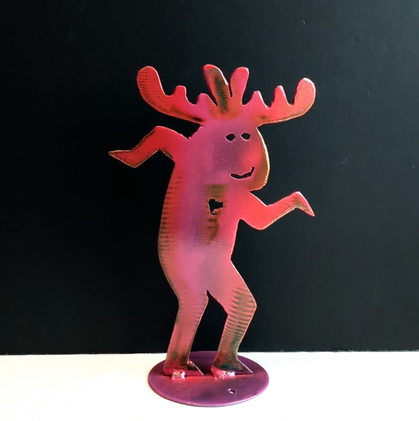 This jazzy moose is approx. 8” tall x 6” wide. His sturdy base also has holes in it, allowing you to screw it to an outdoor wall or fence.