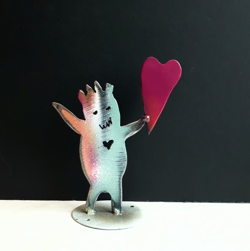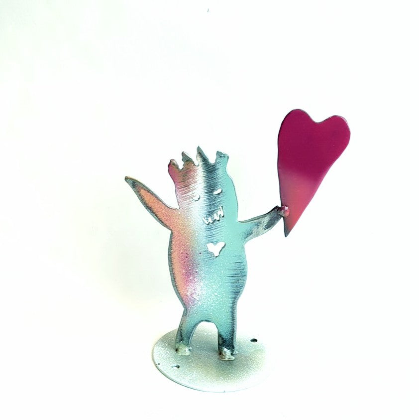 Clearly the artist here has a sense of humour....his love of fun and loose style drawing comes out in this playful collection of creatures. JP hand-cuts his designs with a plasma cutter in recycled steel, often with the original paint still on it. The result is rustic, creative and no two pieces are ever alike.
