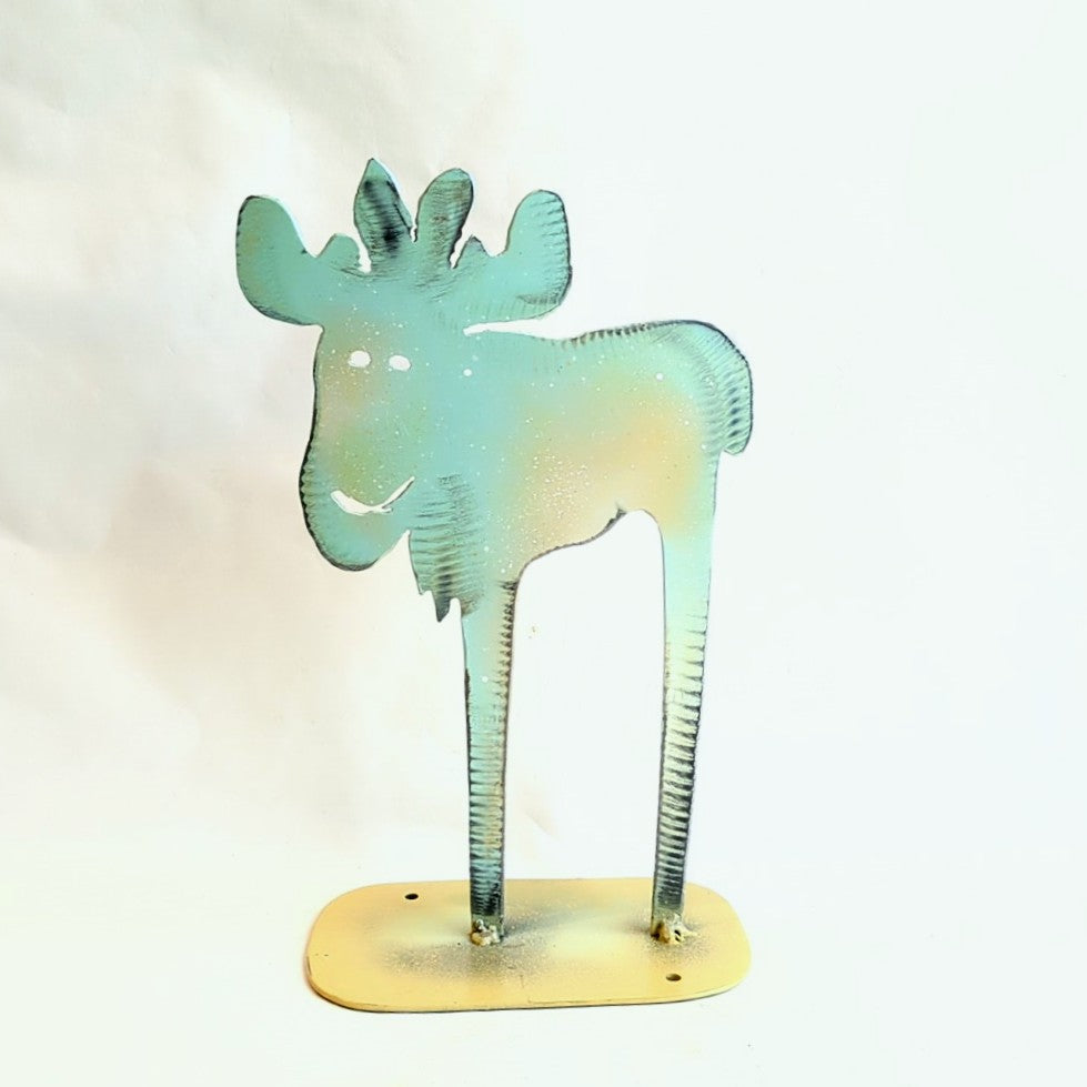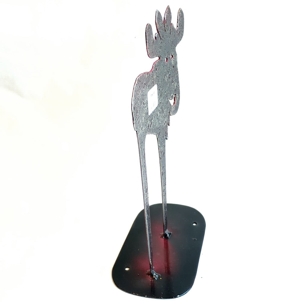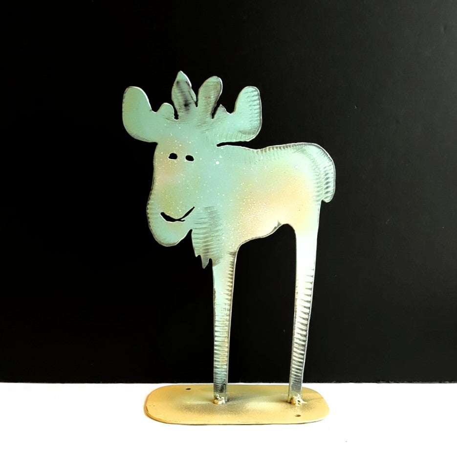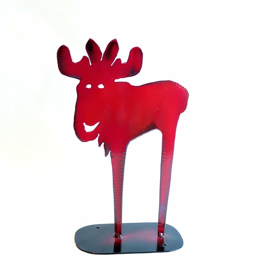 This moose is approx. 10 3/4" tall x 7" wide. The generous base is a stable stand for this tall moose. It also has holes to allow you to screw it to an outdoor (or indoor!) surface for added security.